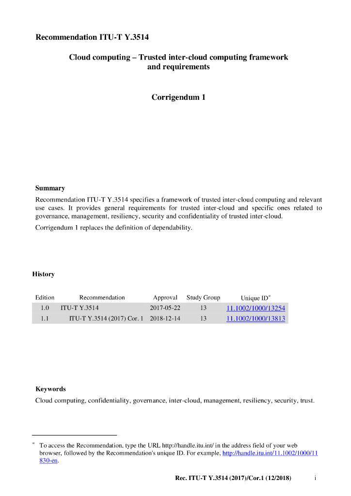 ITU-T Y.3514-2017/Cor 1-2018 云计算 值得信赖的云间计算框架和要求