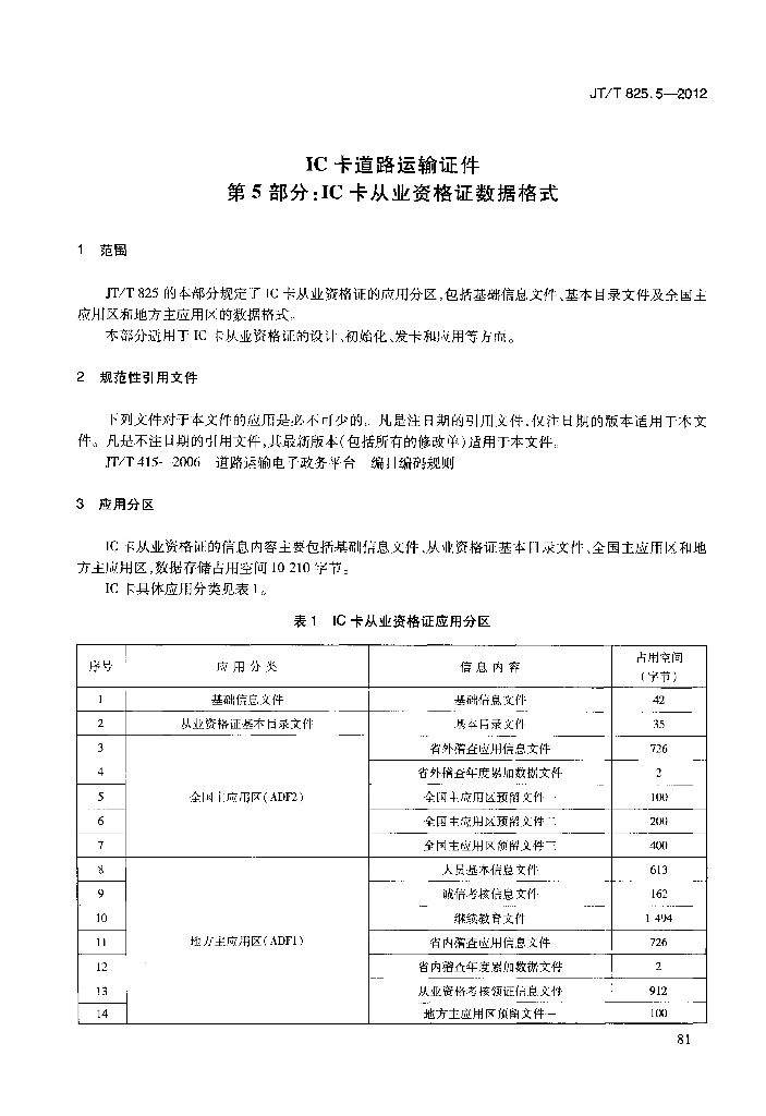 JT/T 825.5-2012 IC卡道路运输证件 第5部分:IC卡从业资格证数据格式