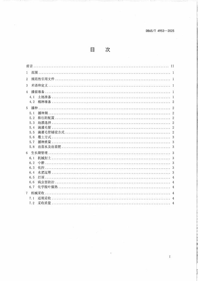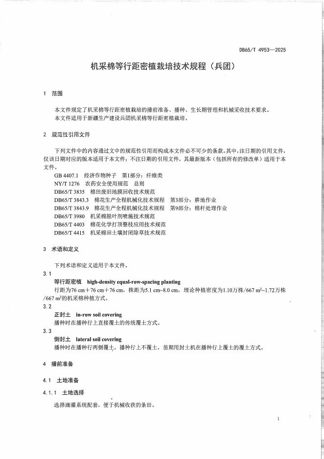 DB65/T 4953-2025 机采棉等行距密植栽培技术规程(兵团)