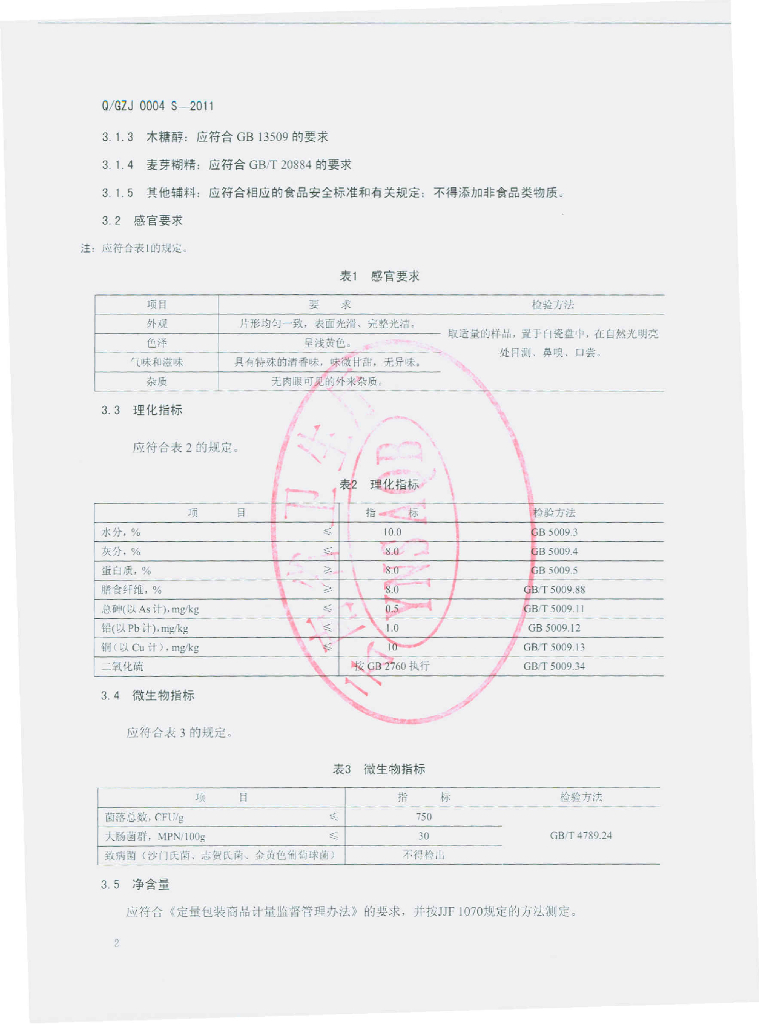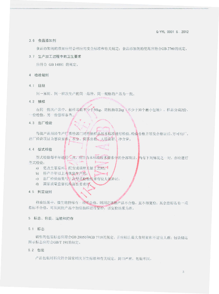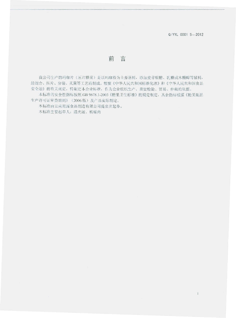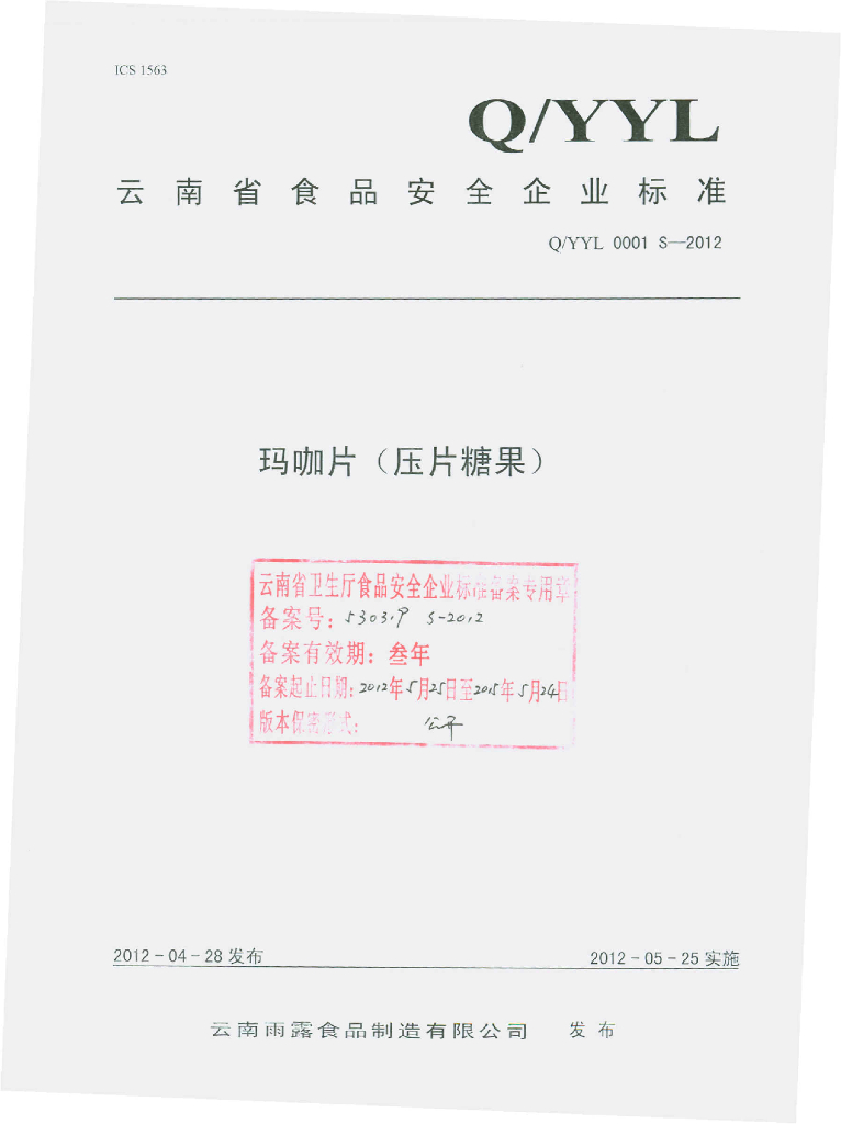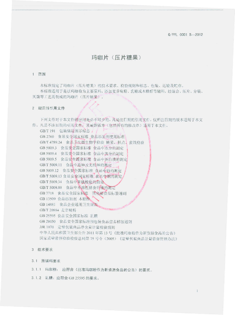 Q/YYL 0001S-2012 玛咖片(压片糖果)