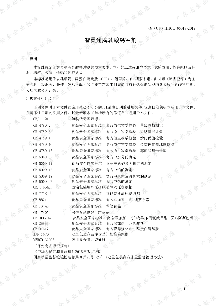 Q/(GF)HHCL 0001S-2019 智灵通牌乳酸钙冲剂