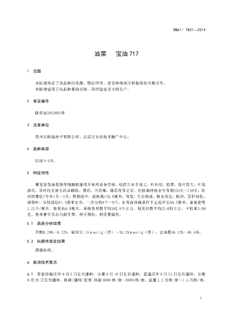 DB61/T 831-2014 油菜 宝油717