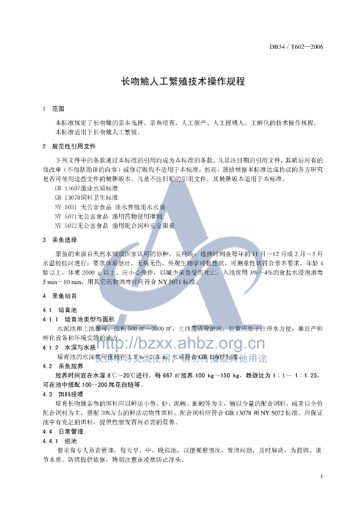 DB34/T 602-2006 长吻鮠人工繁殖技术操作规程