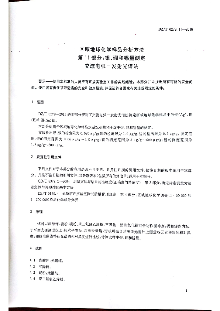 DZ/T 0279.11-2016 区域地球化学样品分析方法 第11部分:银、硼和锡量测定交流电弧-发射光谱法