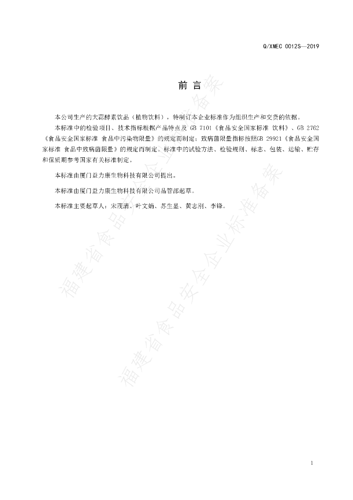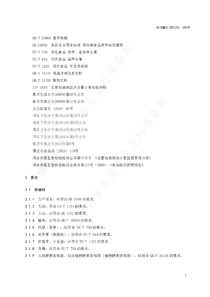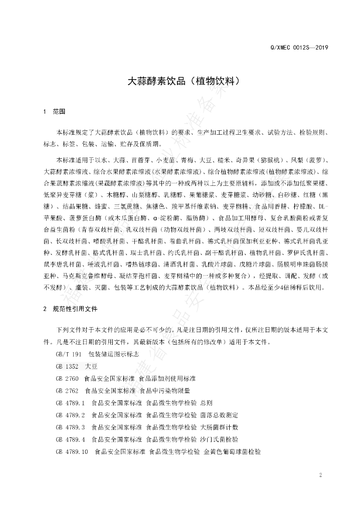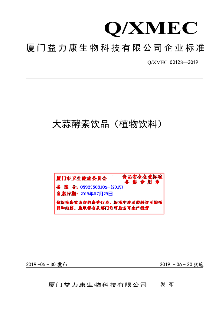 Q/XMEC 0012S-2019 大蒜酵素饮品(植物饮料)