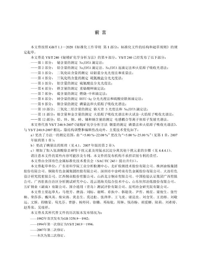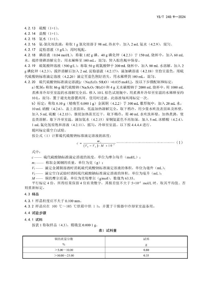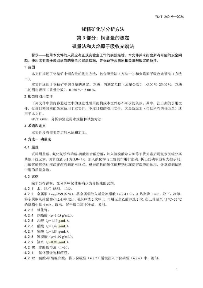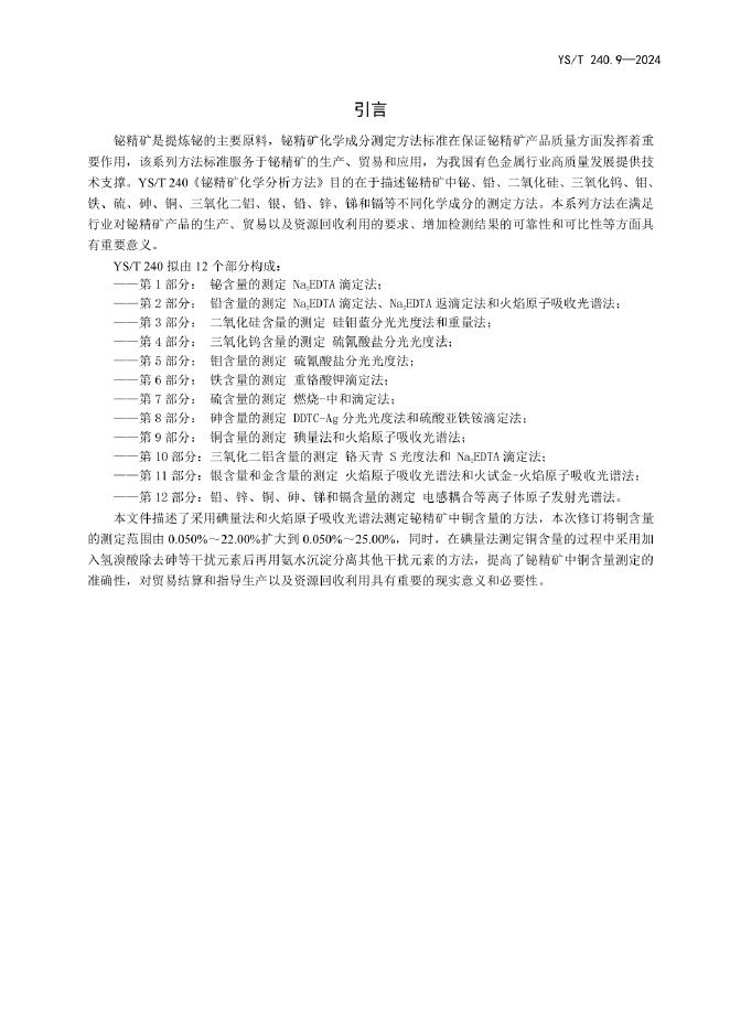 YS/T 240.9-2024 铋精矿化学分析方法 第9部分:铜含量的测定 碘量法和火焰原子吸收光谱法