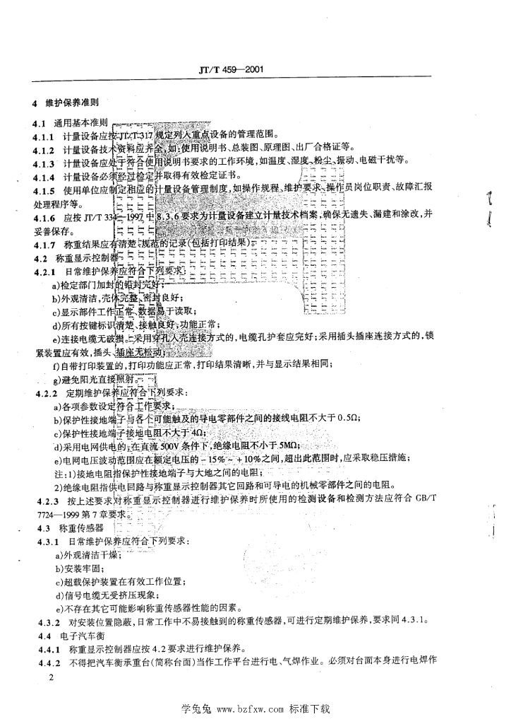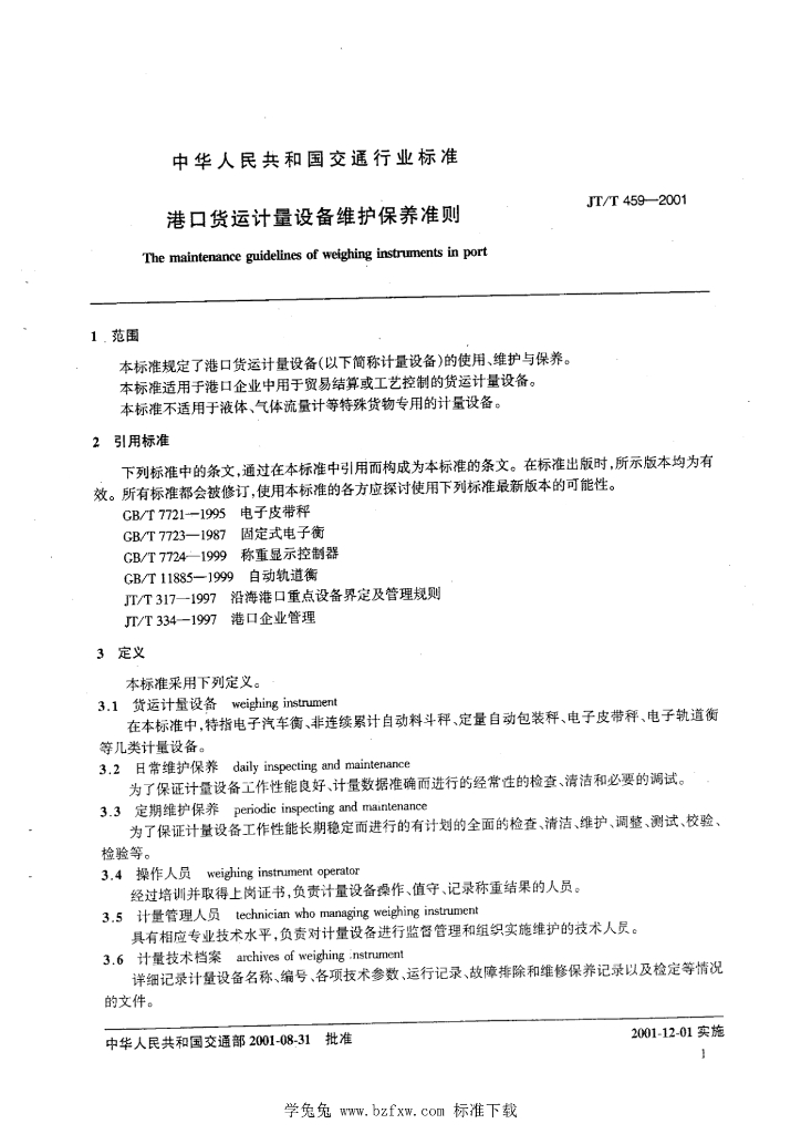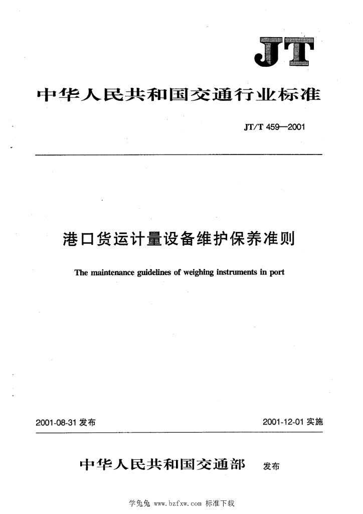 JT/T 459-2001 港口货运计量设备维护保养准则
