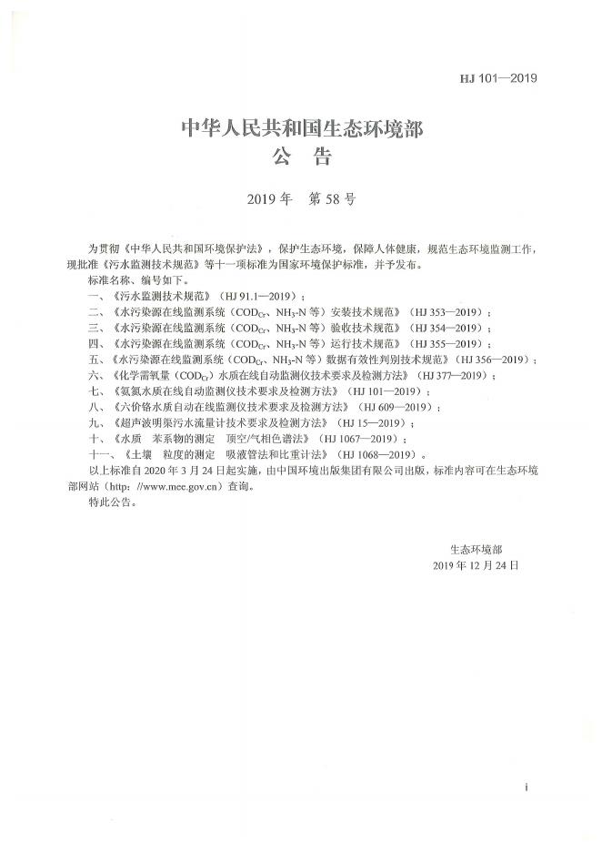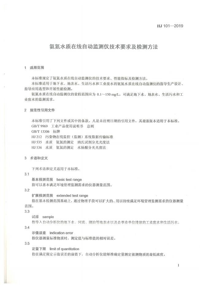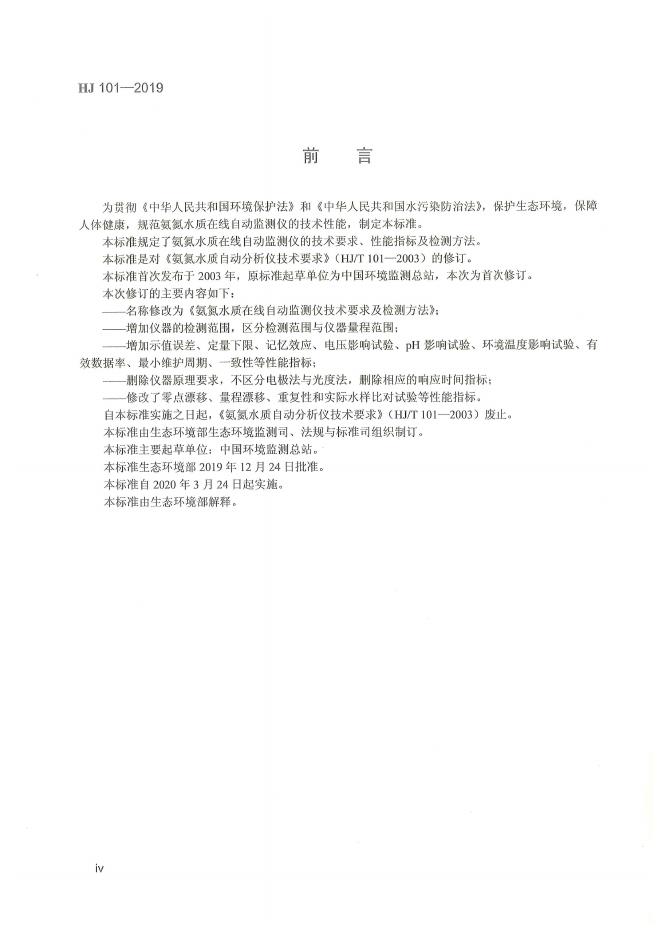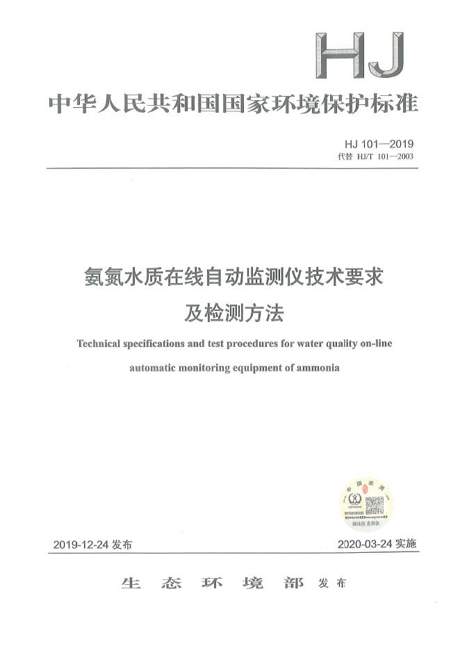 HJ 101-2019 氨氮水质在线自动监测仪技术要求及检测方法