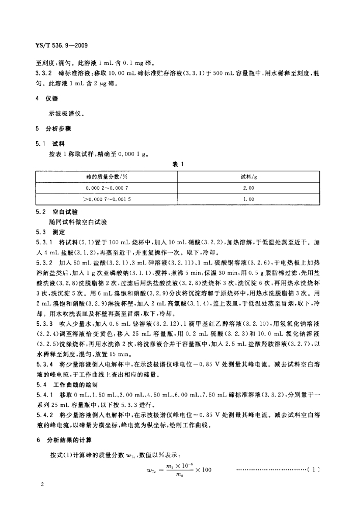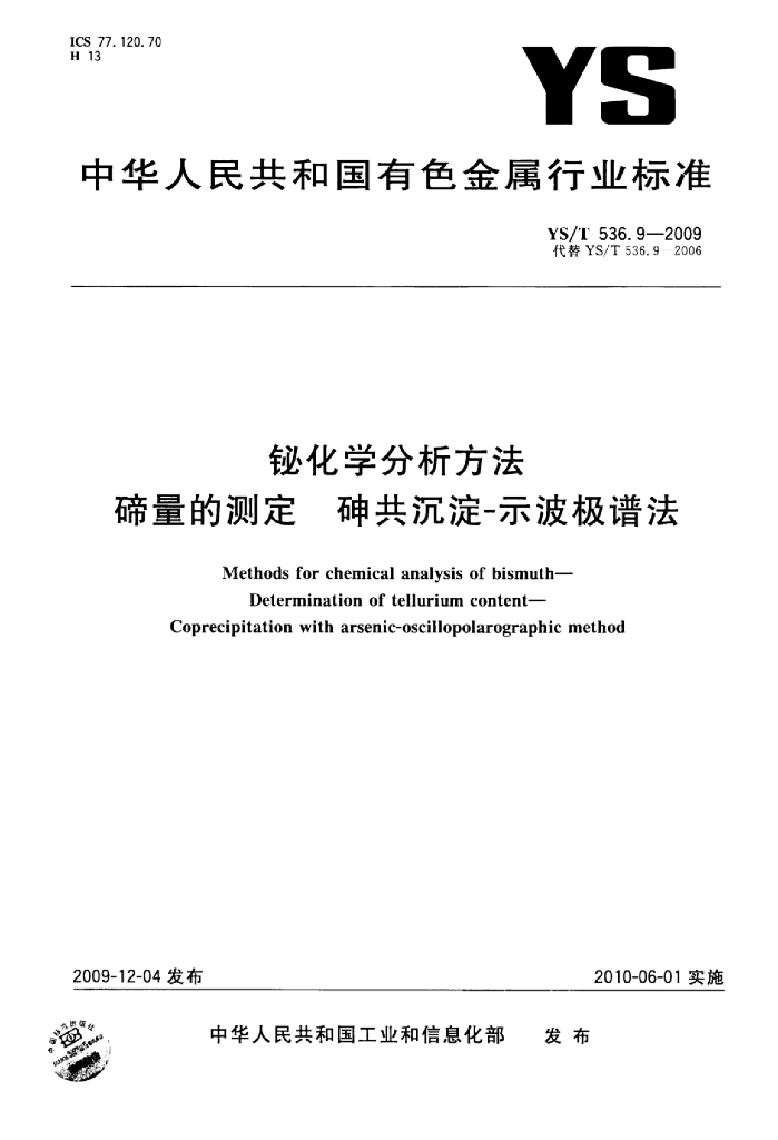 YS/T 536.9-2009 铋化学分析方法碲量的测定砷共沉淀-示波极谱法