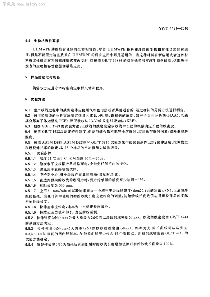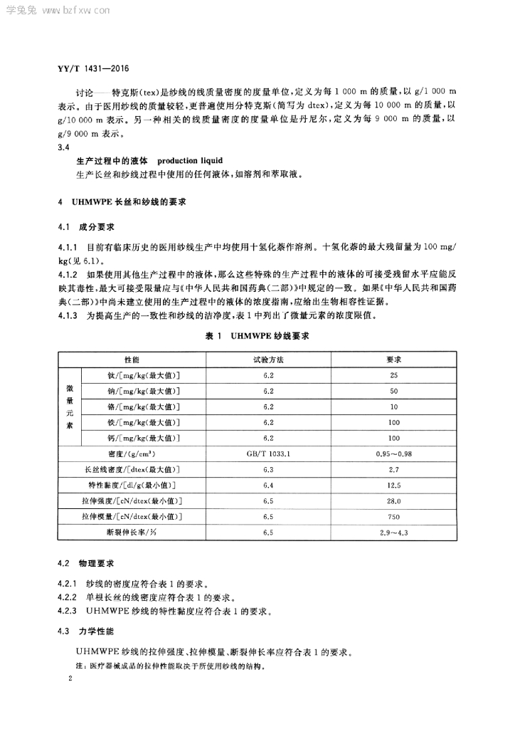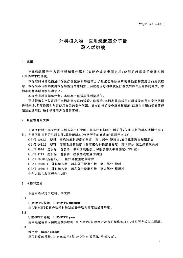 YY/T 1431-2016 外科植入物医用级超高分子量聚乙烯纱线