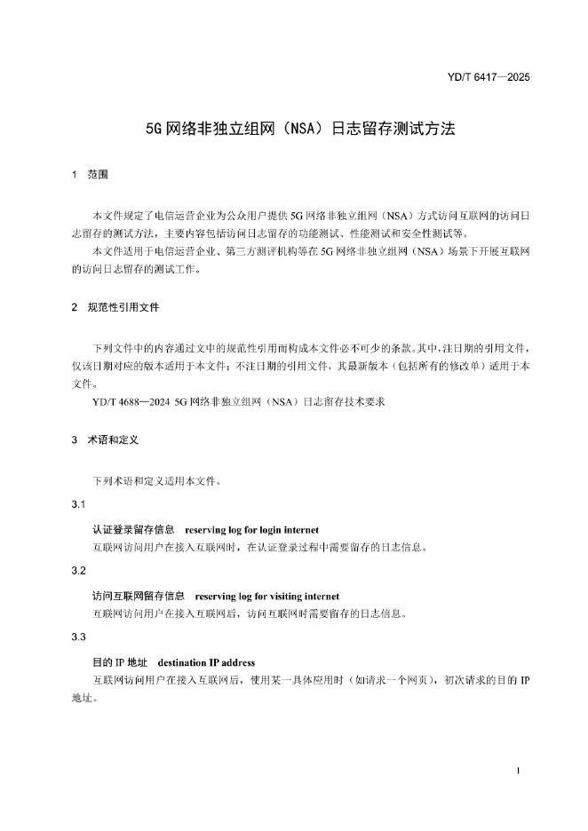 YD/T 6417-2025 5G网络非独立组网(NSA)日志留存测试方法