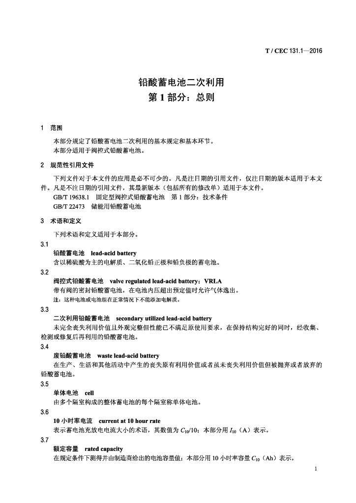 T/CEC 131.1-2016 铅酸蓄电池二次利用 第1部分:总则