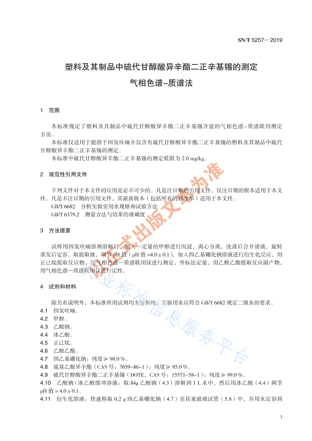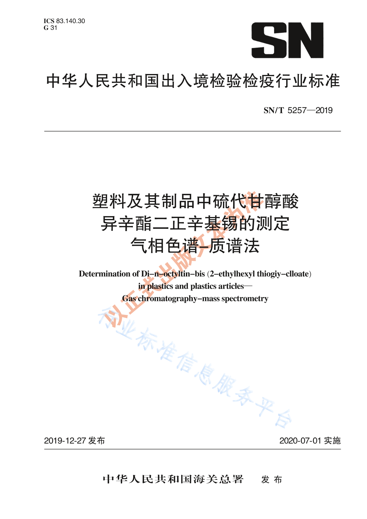 SN/T 5257-2019 塑料及其制品中硫代甘醇酸异辛酯二正辛基锡的测定 气相色谱-质谱法