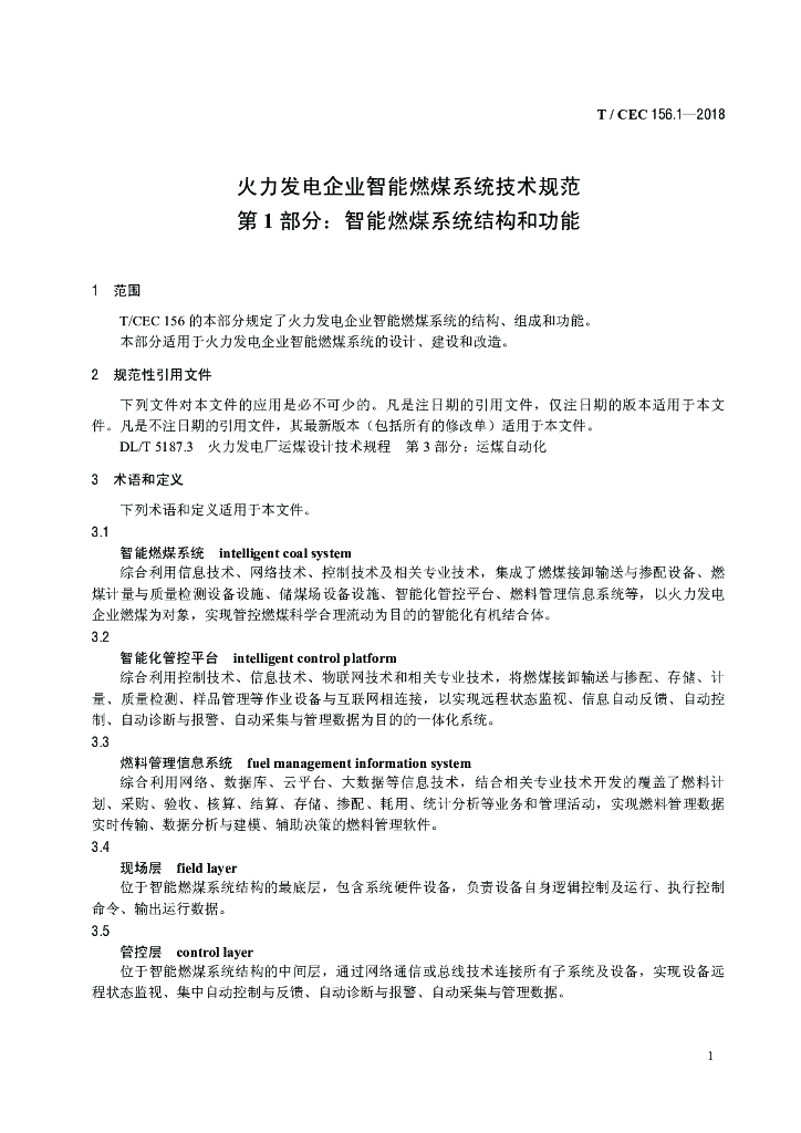 T/CEC 156.1-2018 火力发电企业智能燃煤系统技术规范 第1部分:智能燃煤系统结构和功能