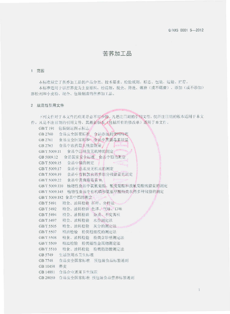 Q/HXS 0001S-2012 苦荞加工品
