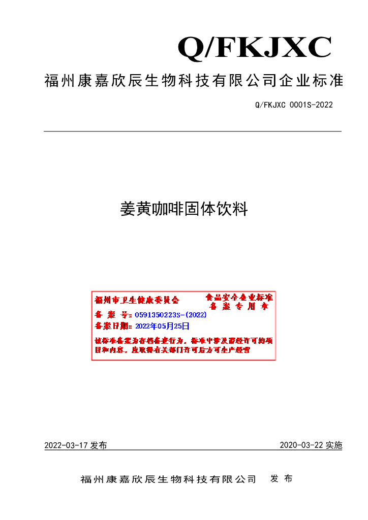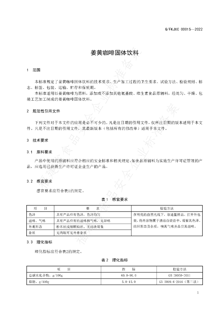 Q/FKJXC 0001S-2022 姜黄咖啡固体饮料