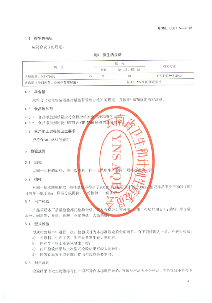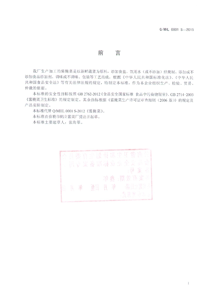 Q/MHL 0001S-2015 弥勒市鹤立酱菜厂 酱腌菜