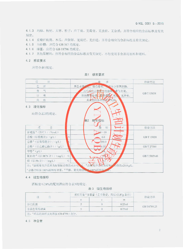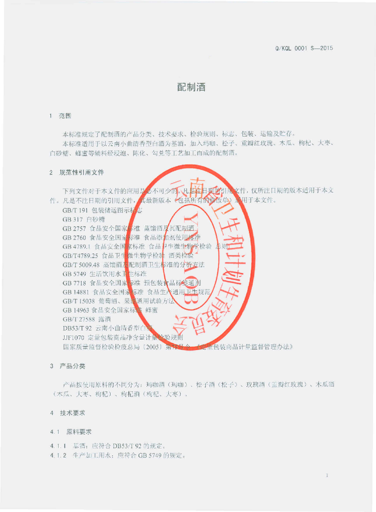 Q/KQL 0001S-2015 昆明市寻甸县金所青龙酒厂 配制酒