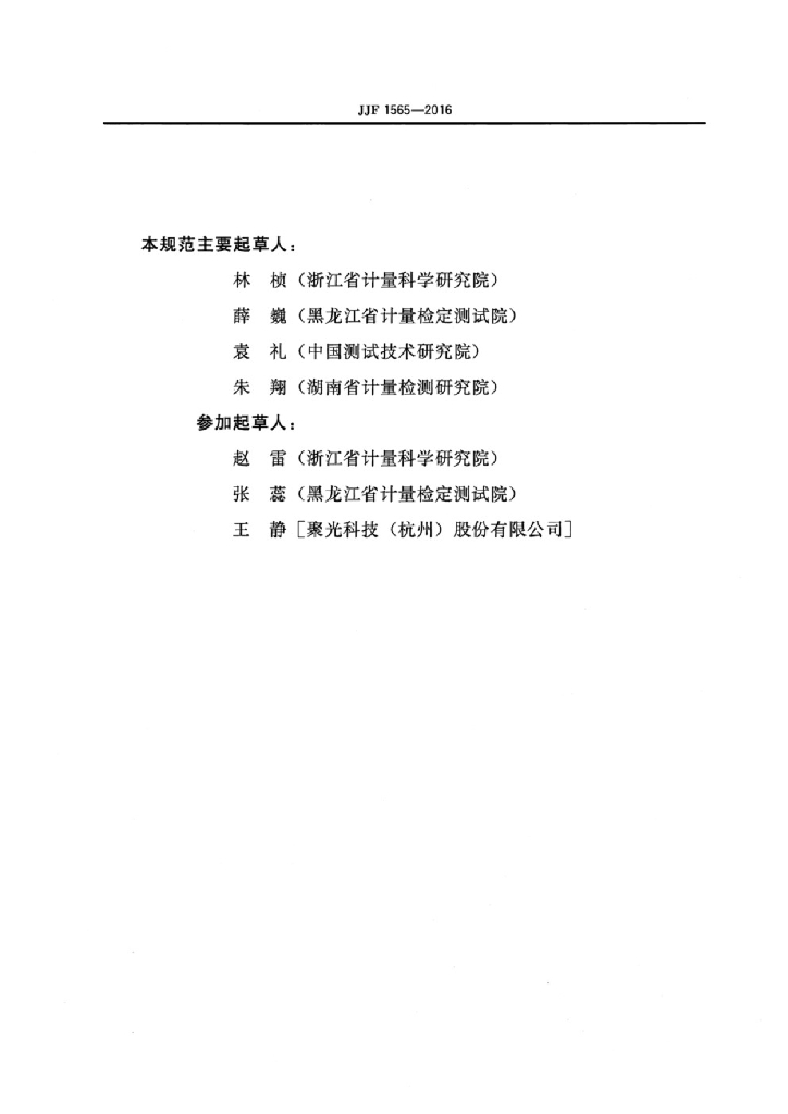 林祯(浙江省计量科学研究院)、薛巍(黑龙江省计量检定测试院)、袁礼(中国测试技术研究院)、朱翔(湖南省计量检测研究院)、赵雷(浙江省计量科学研究院)、张蕊(黑龙江省计量检定测试院)、王静(聚光科技(杭州)股份有限公司)
