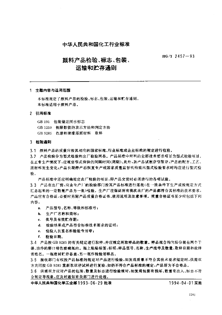 HG/T 2457-1993 颜料产品检验、标志、包装、运输和贮存通则