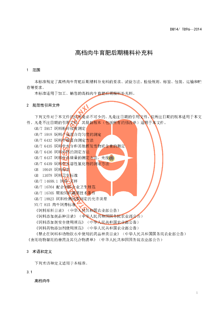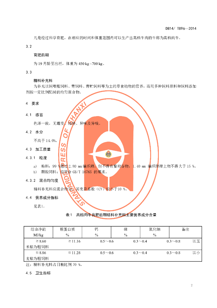 DB14/T 896-2014 高档肉牛育肥后期精料补充料