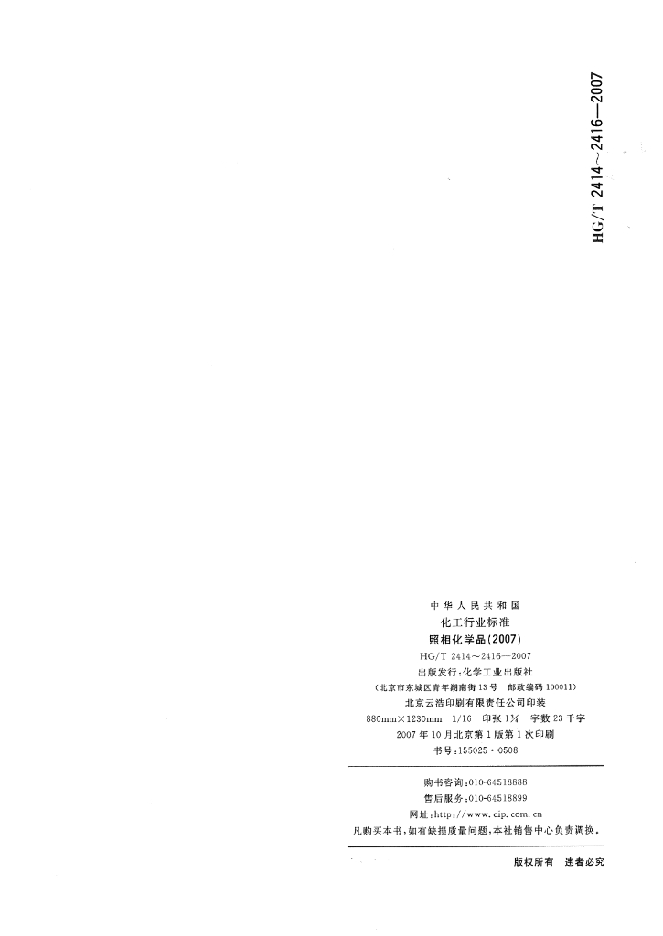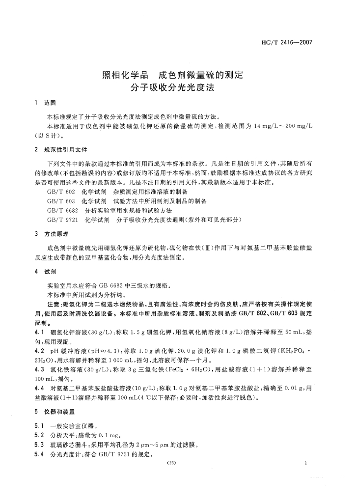 HG/T 2416-2007 照相化学品 成色剂微量硫的测定 分子吸收分光光度法