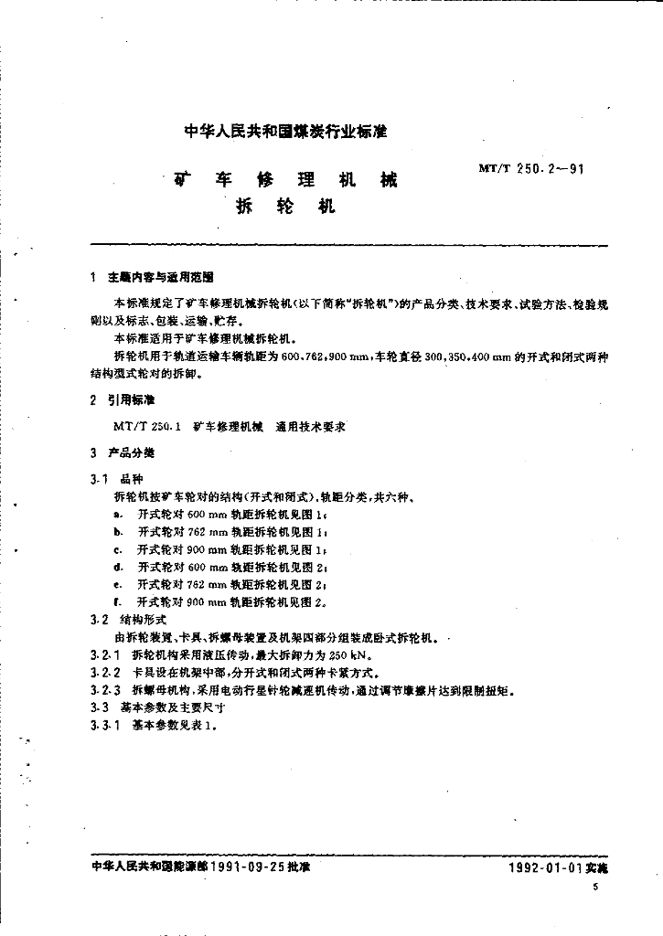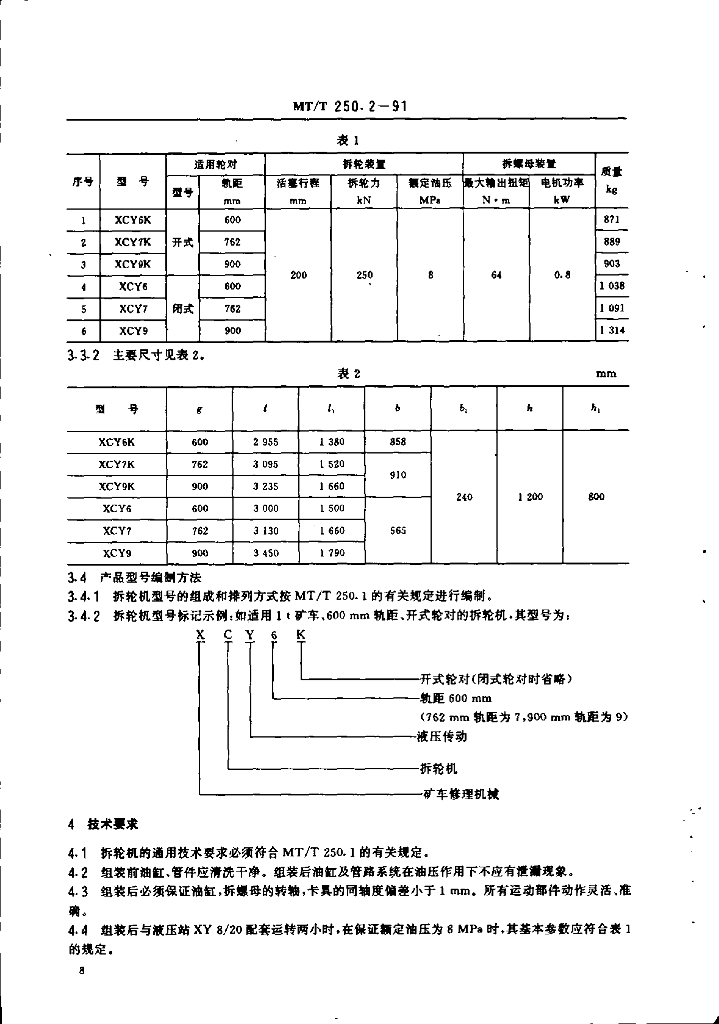 MT/T 250.2-1991 矿车修理机械拆轮机