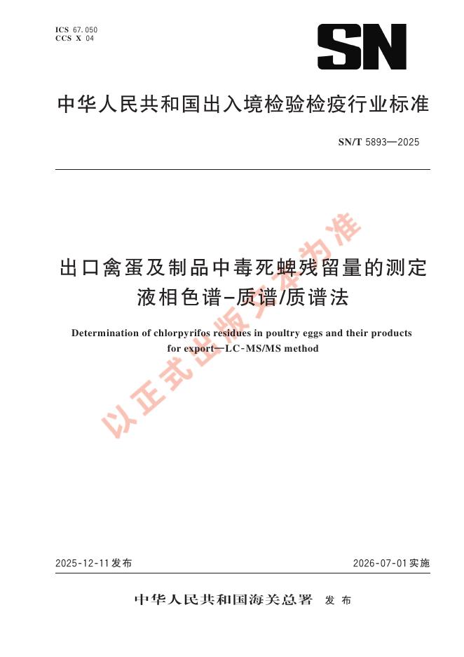 SN/T 5893-2025 出口禽蛋及制品中毒死蜱残留量的测定 液相色谱-质谱/质谱法