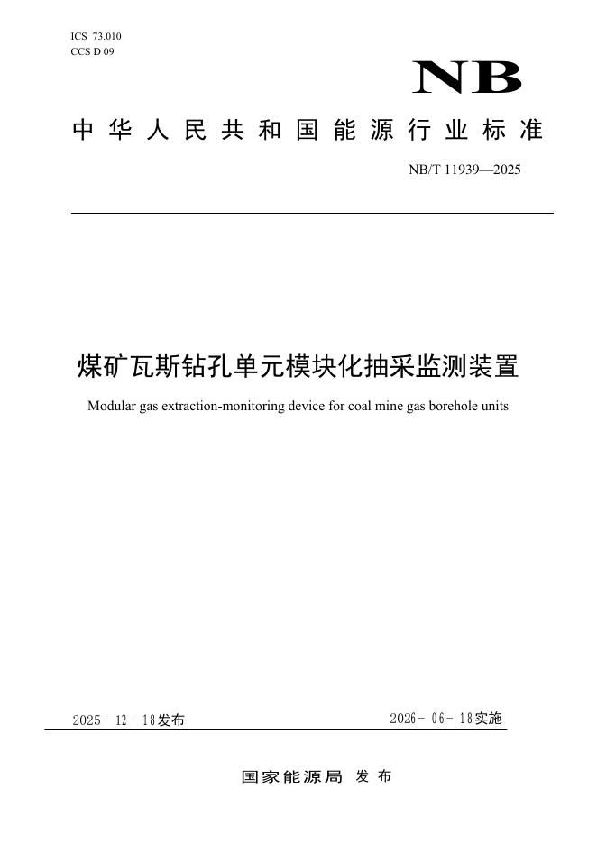 NB/T 11939-2025 煤矿瓦斯钻孔单元模块化抽采监测装置