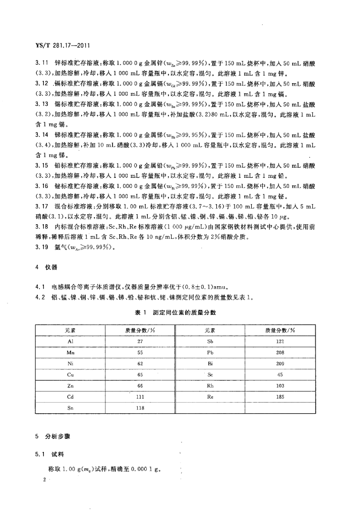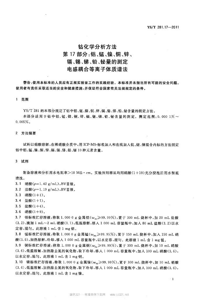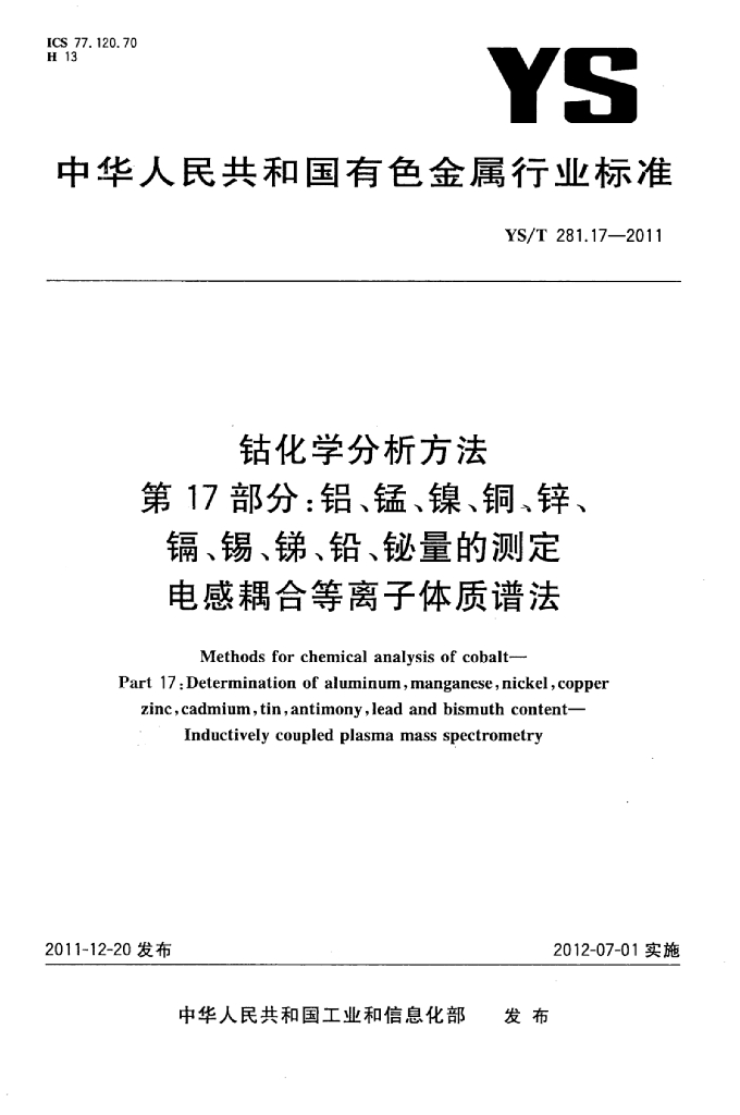 YS/T 281.17-2011 钴化学分析方法 第17部分:铝、锰、镍、铜、锌、镉、锡、锑、铅、铋量的测定电感耦合等离子体质谱法