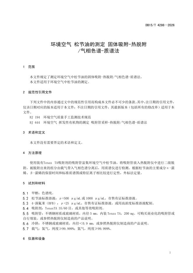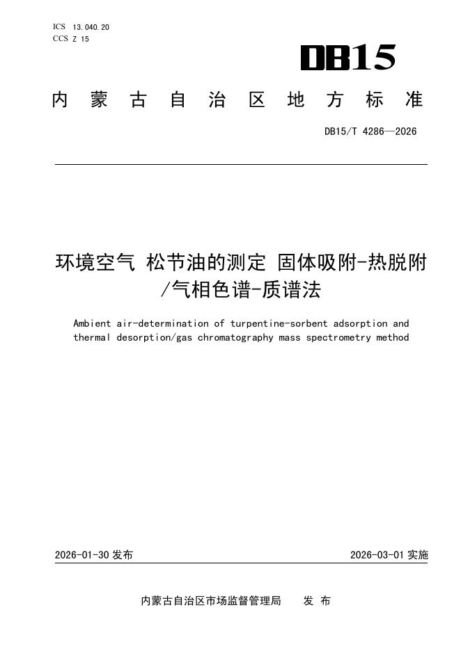 DB15/T 4286-2026 环境空气 松节油的测定 固体吸附-热脱附/气相色谱-质谱法
