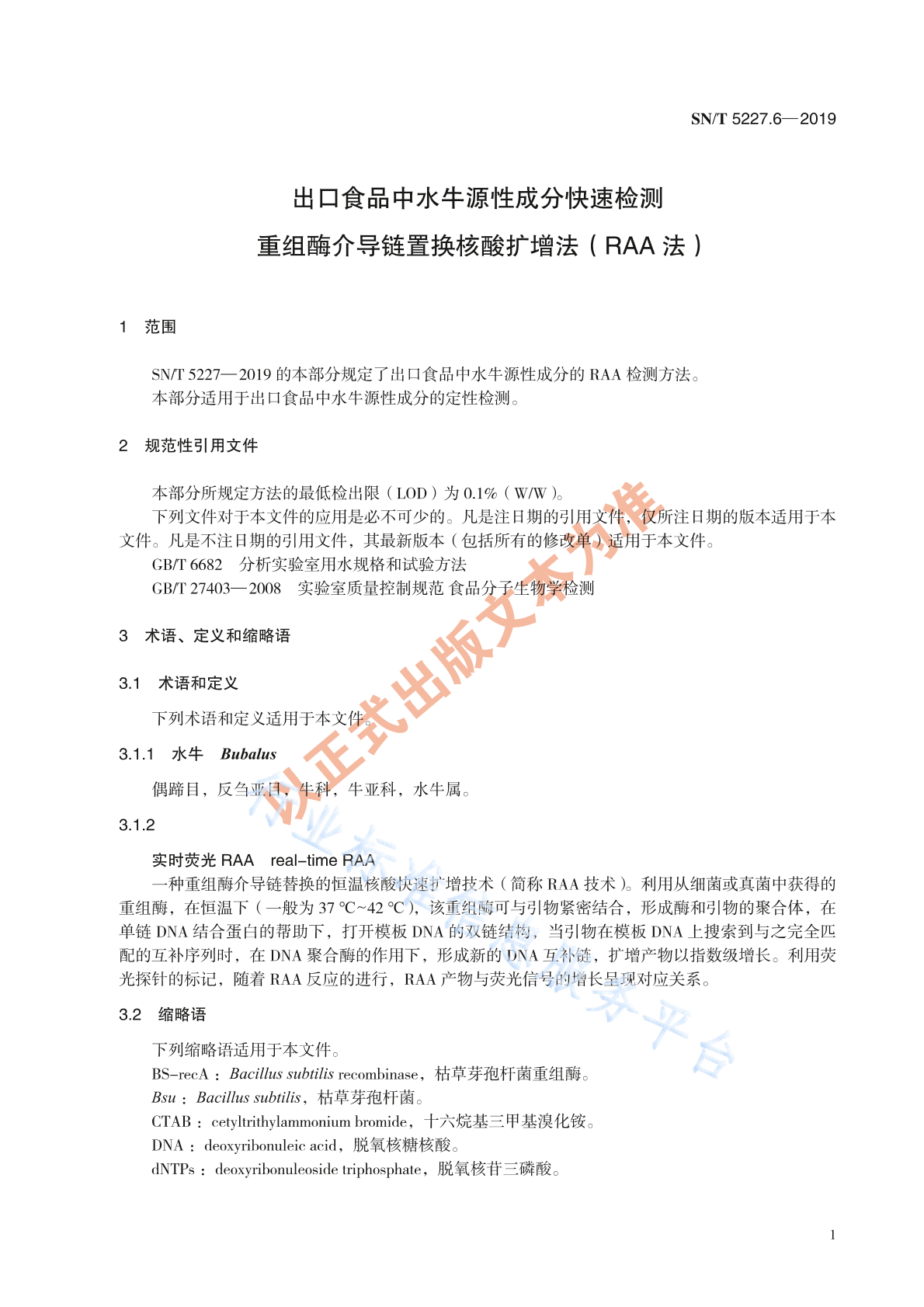SN/T 5227.6-2019 出口食品中水牛源性成分快速检测 重组酶介导链替换核酸扩增法(RAA法)