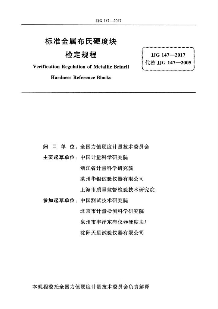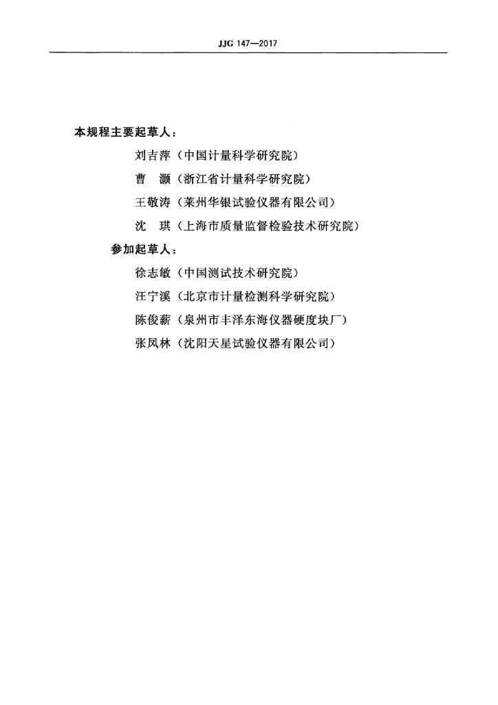 刘吉萍(中国计量科学研究院)、曹颧(浙江省计量科学研究院)、王敬涛(莱州华银试验仪器有限公司)、沈琪(上海市质量监督检验技术研究院)、徐志敏(中国测试技术研究院)、汪宁溪(北京市计量检测科学研究院)、陈俊薪(泉州市丰泽东海仪器硬度块厂)、张凤林(沈阳天星试验仪器有限公司)