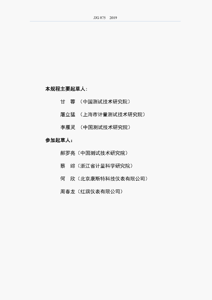 甘蓉(中国测试技术研究院)、屠立猛(上海市计量测试技术研究院)、李雁灵(中国测试技术研究院)、郝罗亮(中国测试技术研究院)、蔡绯(浙江省计量科学研究院)、何欣(北京康斯特仪表科技股份有限公司)、周春龙(红旗仪表有限公司)