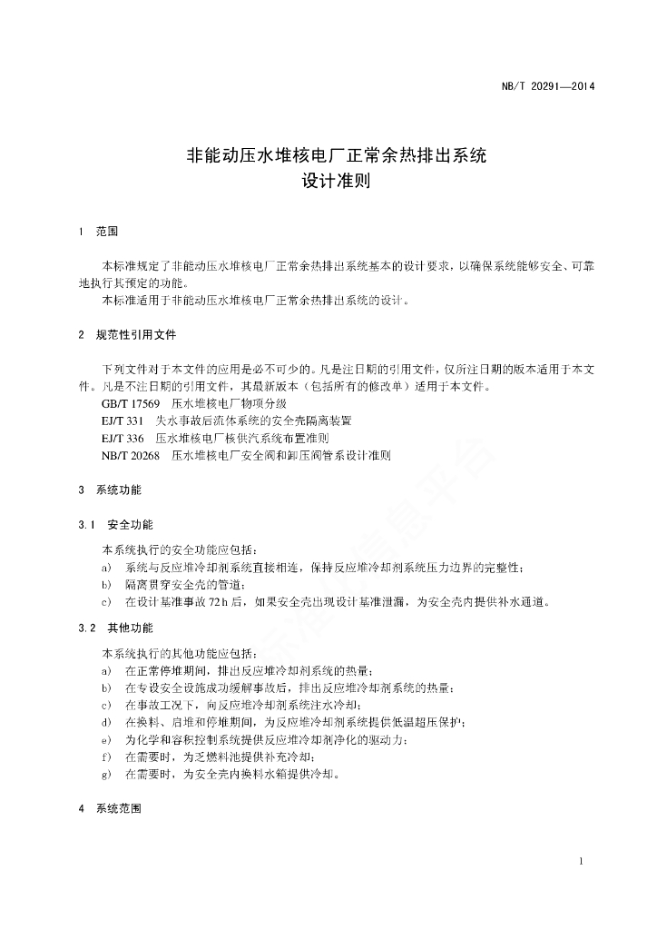 NB/T 20291-2014 非能动压水堆核电厂正常余热排出系统设计准则