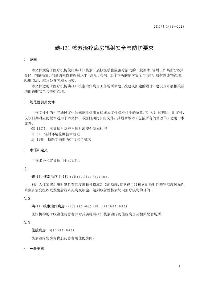 DB11/T 2478-2025 碘-131核素治疗病房辐射安全与防护要求