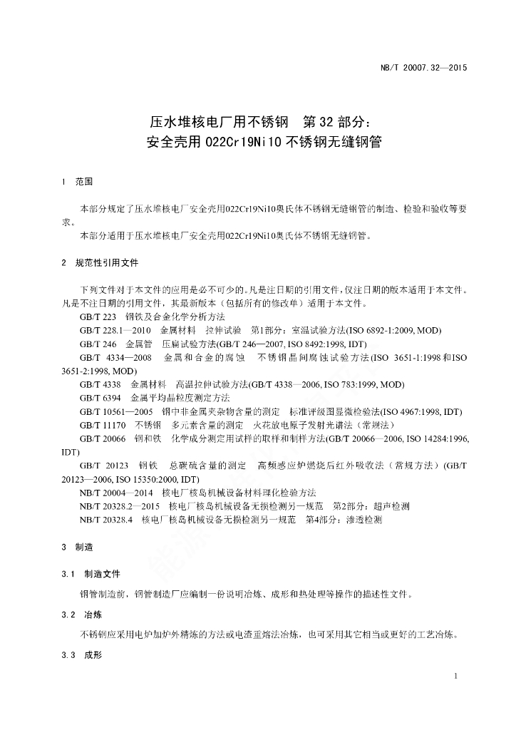 NB/T 20007.32-2015 压水堆核电厂用不锈钢 第32部分:安全壳用022Cr19Ni10不锈钢无缝钢管