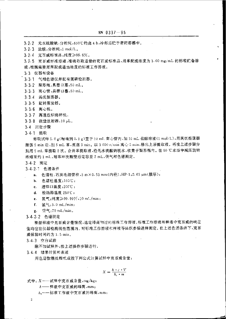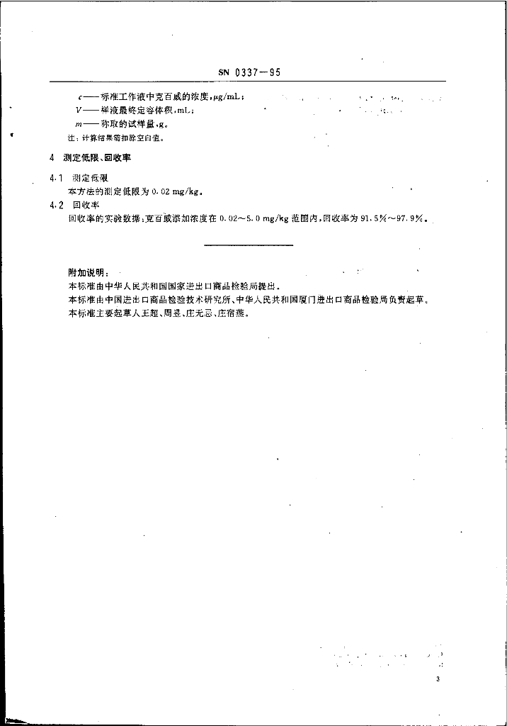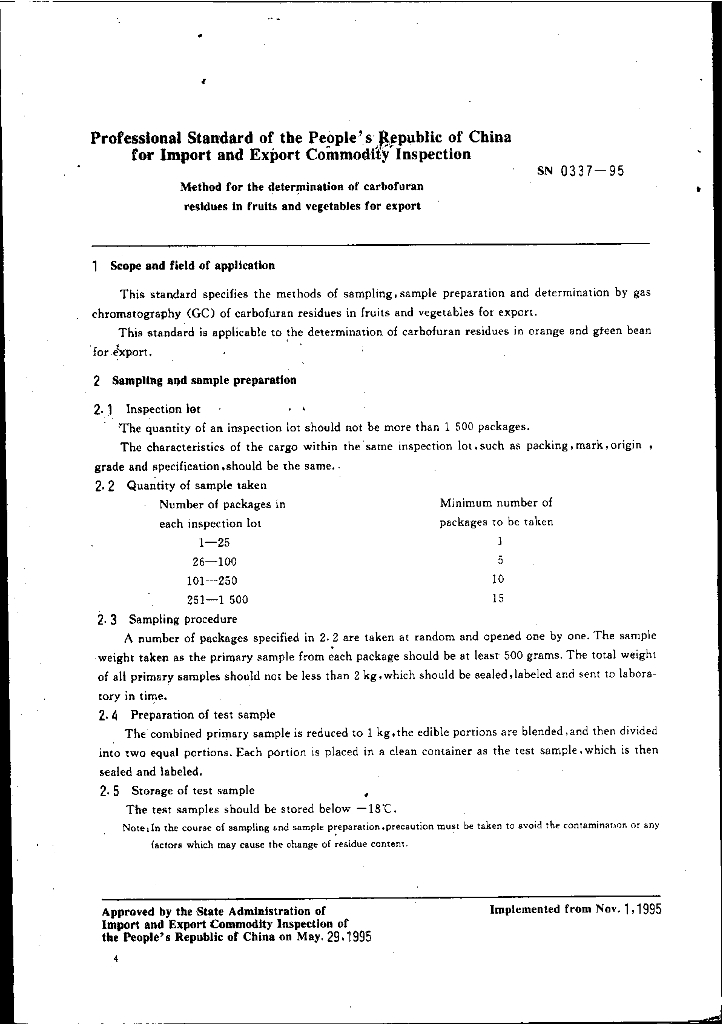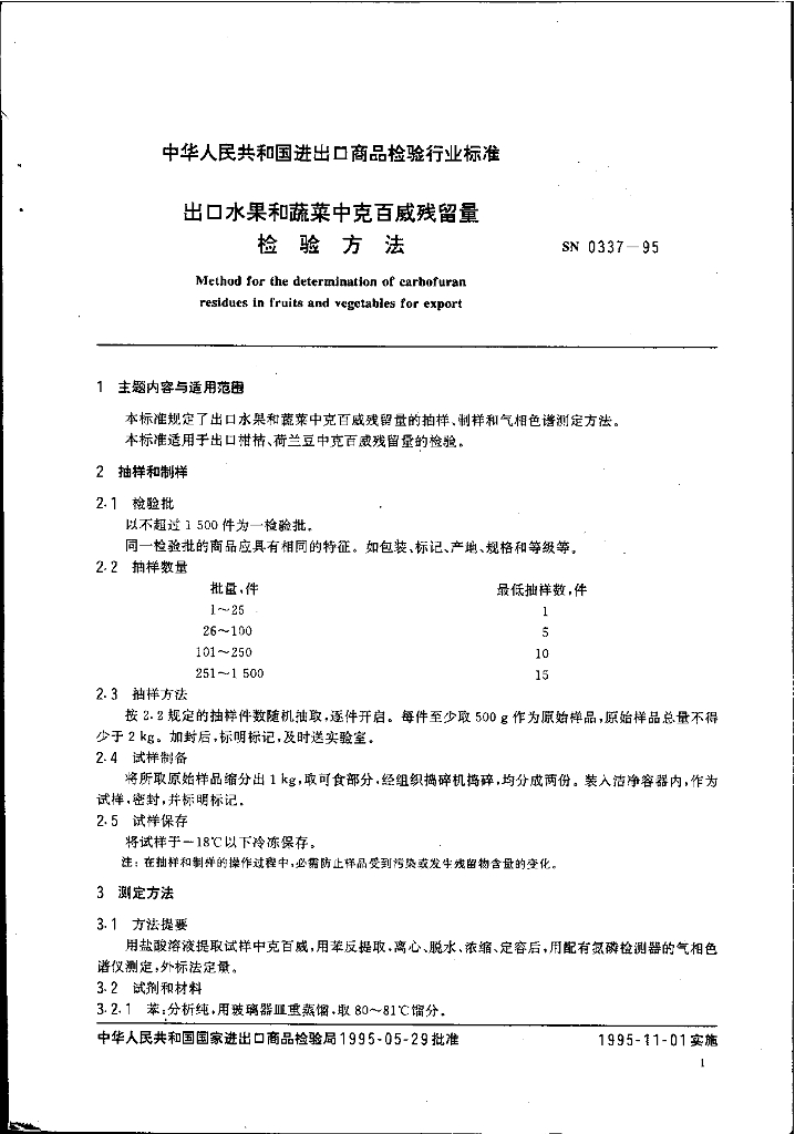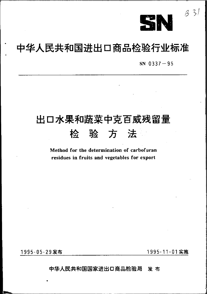 SN 0337-1995 出口水果和蔬菜中克百威残留量检验方法