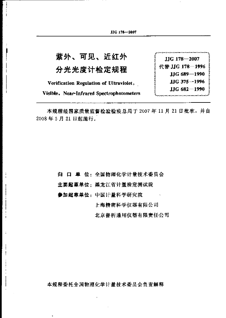 - 代替标准:JJG 178-1996、JJG 689-1990、JJG 375-1996、JJG 682-1990