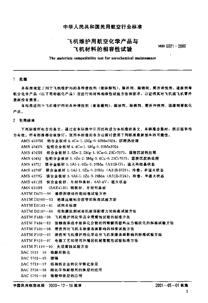MH 6021-2000 飞机维护用航空化学产品与飞机材料的相容性试验