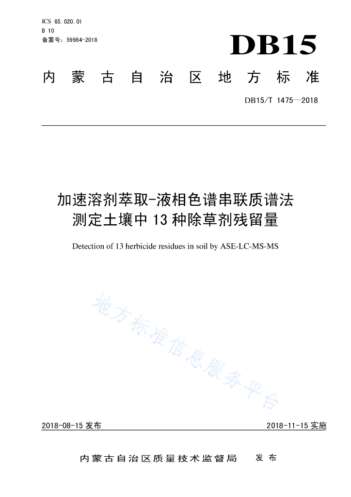 DB15/T 1475-2018 加速溶剂萃取-液相色谱串联质谱法测定土壤中13种除草剂残留量
