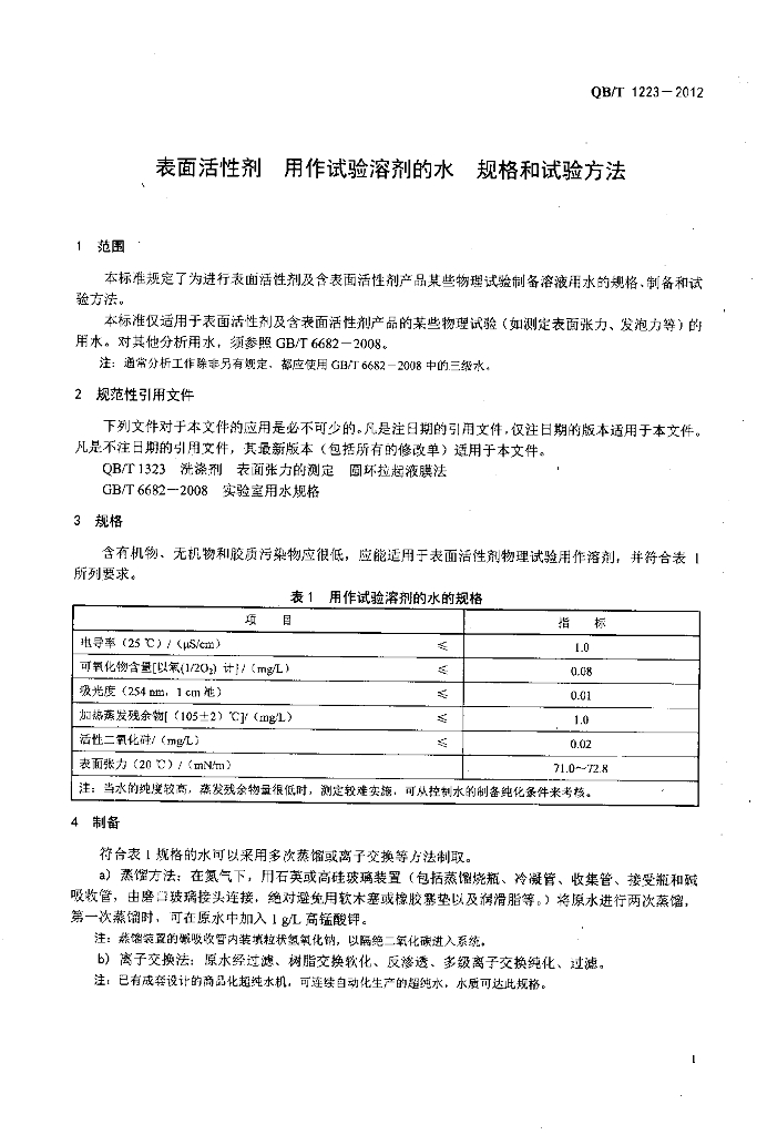 QB/T 1223-2012 表面活性剂用作试验溶 剂的水规格和试验方法