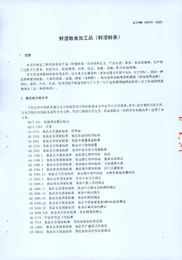 Q/XYMF 0001S-2023 鲜湿粮食加工粉条(鲜湿粉条)