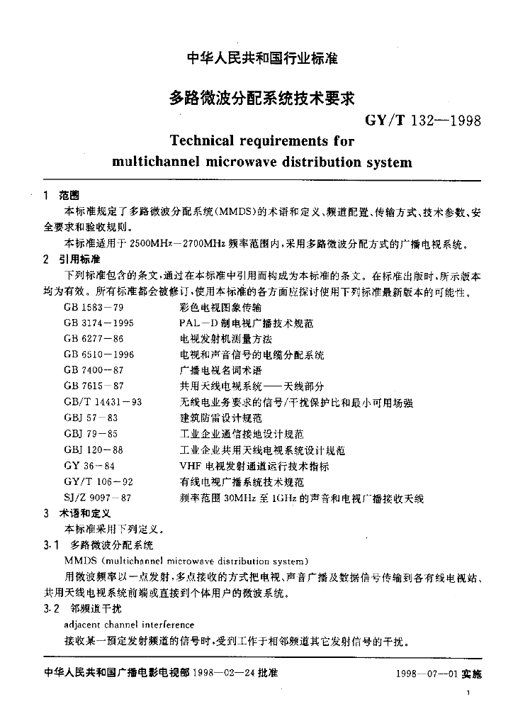 GY/T 132-1998 多路微波分配系统技术要求