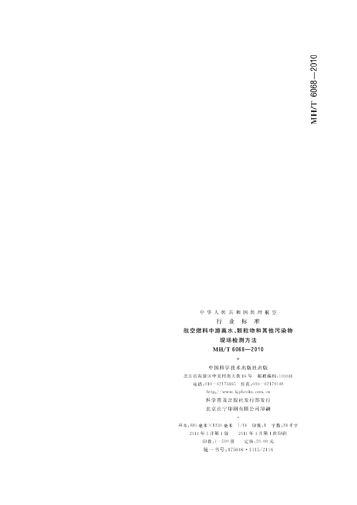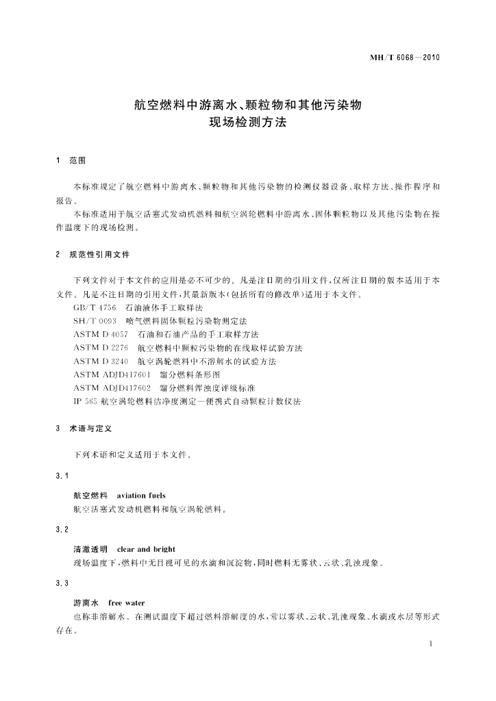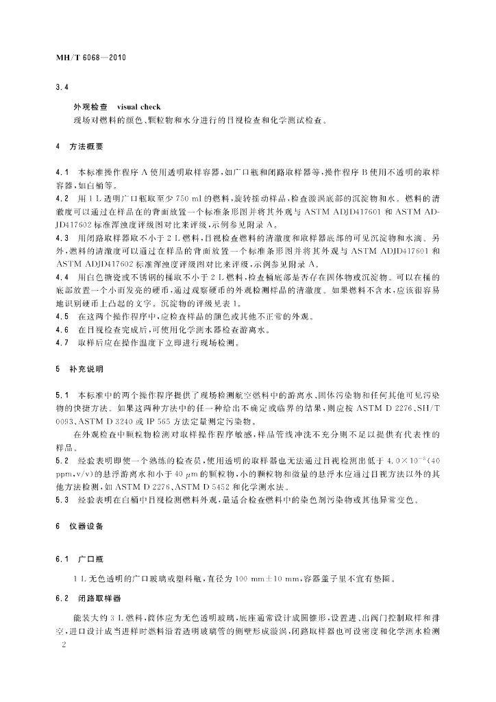 MH/T 6068-2010 航空燃料中游离水、颗粒物和其他污染物现场检测方法