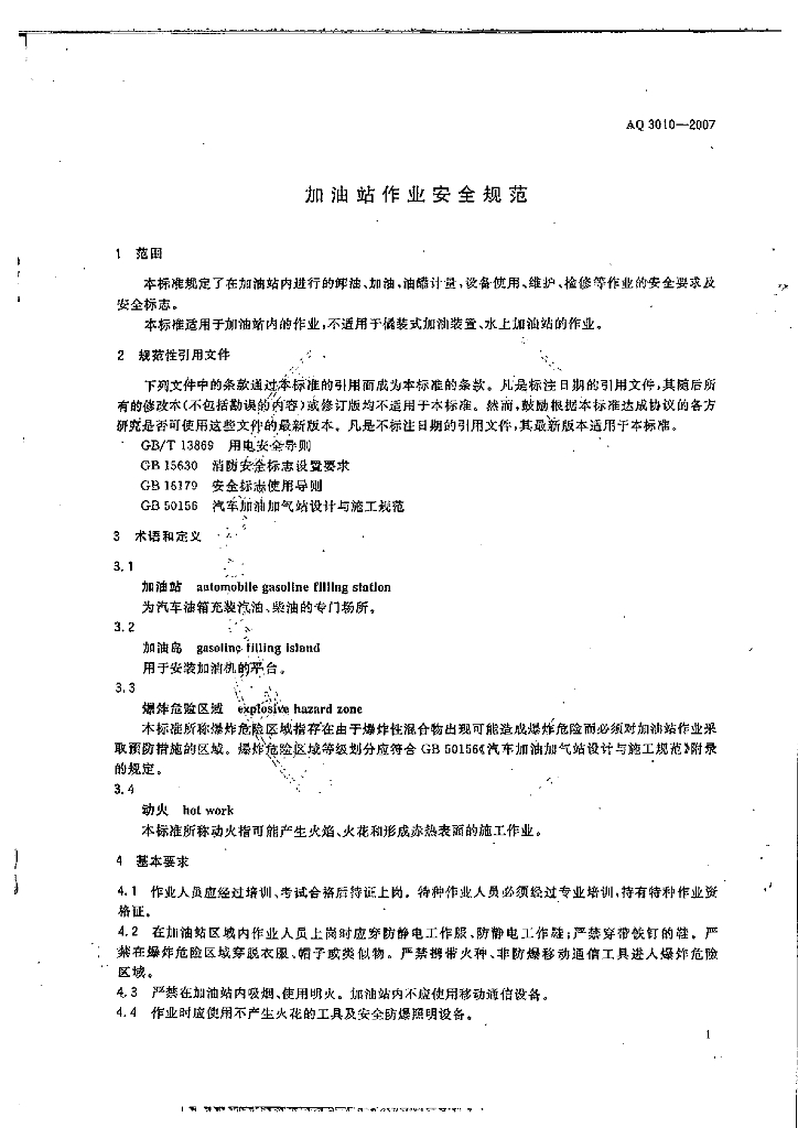AQ 3010-2007 加油站作业安全规范