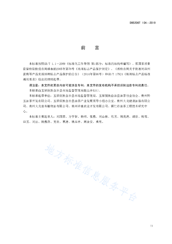 玉屏侗族自治县市场监督管理局、玉屏侗族自治县油茶行业协会、贵州黔玉油茶开发有限公司、玉屏侗族自治县油茶产业发展领导小组办公室、贵州大龙健康油脂有限公司、贵州大龙益寿植物油有限公司、贵州祥驰农业开发有限公司、铜仁市油茶工程技术研究中心