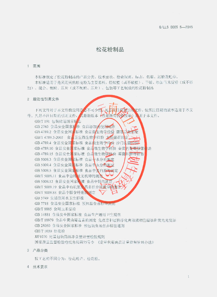 Q/LLS 0005S-2015 丽江程海湖天然螺旋藻生产基地有限公司 松花粉制品