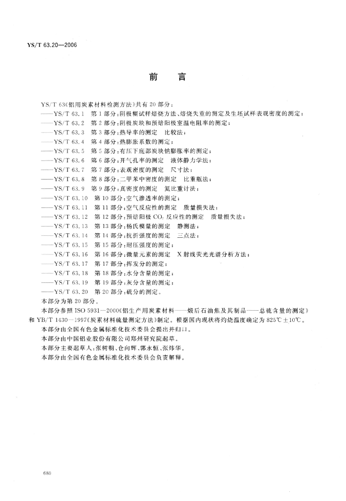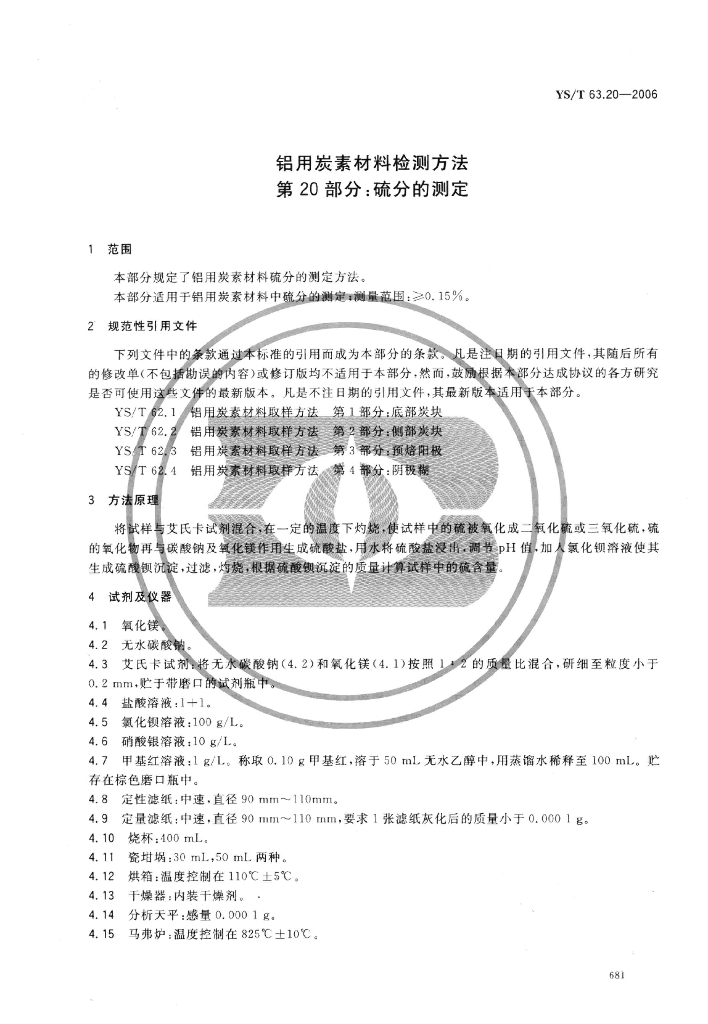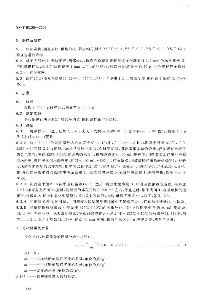 YS/T 63.20-2006 铝用炭素材料检测方法 第20部分:硫分的测定