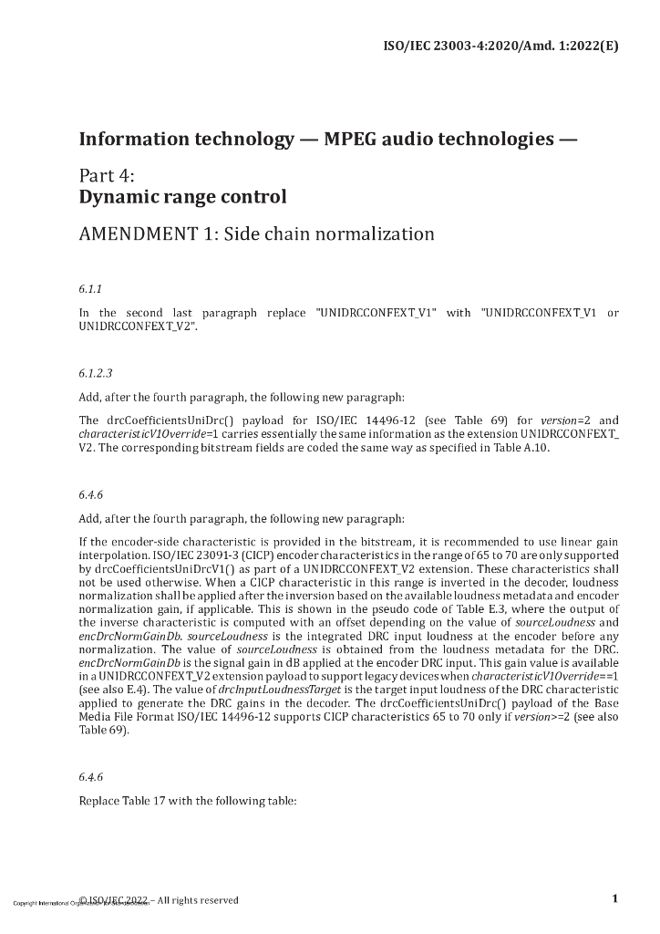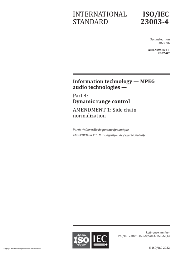 ISO/IEC 23003-4-2020/Amd 1-2022 信息技术 MPEG音频技术 第4部分:动态范围控制 修订1:侧链标准化